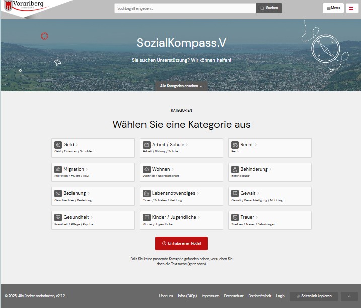 Der SozialKompass.V für Vorarlberg bündelt alle Sozialeinrichtungen auf einer zentralen Webseite. Menschen, die Hilfe suchen, finden hier schnell den passenden Kontakt für ihr Anliegen.